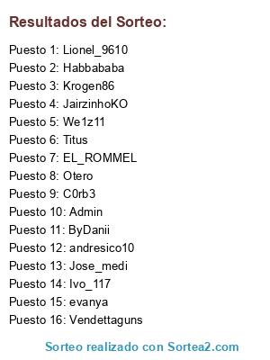 Lista de participantes: Habbababa, Lionel_9610, Otero, Titus, Admin, Krogen86, evanya, ByDanii, Vendettaguns, JairzinhoKO, Jose_medi, andresico10, EL_ROMMEL, C0rb3, Ivo_117, We1z11.