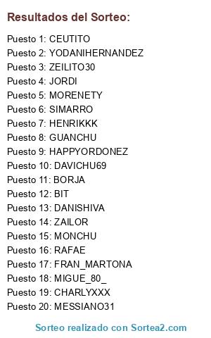 Lista de participantes: JORDI, CEUTITO, BORJA, HENRIKKK, MORENETY, DAVICHU69, MIGUE_80_, YODANIHERNANDEZ, BIT, MESSIANO31, ZEILITO30, HAPPYORDONEZ, SIMARRO, CHARLYXXX, FRAN_MARTONA, DANISHIVA, RAFAE, MONCHU, GUANCHU, ZAILOR.