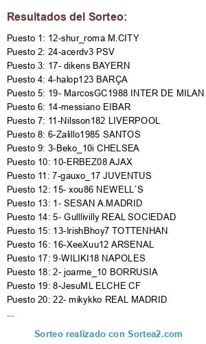 Lista de participantes: 1- SESAN A.MADRID, 2- joarme_10 BORRUSIA, 3-Beko_10i CHELSEA, 4-halop123 BARÇA, 5- Gulllivilly REAL SOCIEDAD, 6-Zalillo1985 SANTOS, 7-gauxo_17 JUVENTUS, 8-JesuML ELCHE CF, 9-WILIKI18 NAPOLES, 10-ERBEZ08 AJAX, 11-Nilsson182 LIVERPOOL, 12-shur_roma M.CITY, 13-IrishBhoy7 TOTTENHAN, 14-messiano EIBAR, 15- xou86 NEWELL´S, 16-XeeXuu12 ARSENAL, 17- dikens BAYERN, 18-Super_Ciclon_2 SEVILLA, 19- MarcosGC1988 INTER DE MILAN, 20- ISS21 REAL JAEN, 21-Standbyx BETIS, 22- mikykko REAL MADRID, 23-Kerman10 M.UNITED, 24-acerdv3 PSV.