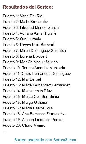 Lista de participantes: Irati Piñero Rojo, Curra Gonzalez, Gemma Ferran, Francina Sunyer, Patricia Gonzl, Sol Garcia Alfranca, Cristina Algar París, Joan Comorera Estarellas, Marcos GR, Belen Fernandez, Natalia Lopez, Rosa Jimenez Castillo, Escarlata Prince, Merchuti TuttiFruti, Mari Ramirez Lopez, Elena Comorera, Alicia CarAl, Edurne Anta, Núria Martín Andújar, Cynthia Legoas Speziani, Sol Fernandez Alanzor, Carmen Romero Sararols, Yolanda Lopez, Dany Martí, Silvia Alvarez Ferre, Paloma Bautista Sierra, Nuria Luna Rubio, Jesus Gordo, Frida Mara Harry, Maria Prats Mancas, Gioconda Ondina Ordosgoitti Fermin, Bianca Maria, Maria Gemma García, Joel Rojo Andres, Jorge Penny, Marta Leon, Cas Madriz, Monik Yeaah, Mariam Peralta Berenguer, Memen Cebrian, Mayka Vegue, Esmeralda Fornies, Victor Ciurana Ferrer, Adelina Mairata Douat, Maika Quintanilla, Ana B. Delgado, Jose Ignacio Reyes Reyes, Maria Del Mar Sempere Pomares, Patricia Paz, Florencia Mancilla Gómez, Barsine Arriano, Amanda Galvez Mena, Lorenzo Moro, Maite Fernández Fernández, Gabriele Boero, Erikkajah Bahnsinamilan, Elena Arjona Vaya, Sara Perez Martinez, Mary Guan, Maijo Von Tzebrikow, Ana Aguilera, Elena Sanchez, Merçè González, Rosi Legido, Nuria Lopez, Iria Iglesias, Vanessa Vidal Tonn, Marga Galiana, Rebeca Khamlichi, Cherry BT Bicho Raroo, Pilar Delgado Martínez, Sonia Gómez Rubio, Lluna Nei, Ana Barranco Fernandez, Sabine Segura, Maria Vazquez Vega, Gala Con Begoña Lasa, Pepa Charfolé, Virginia González Mariño, Lourdes Boneu, Lara Caamaño, Alvaro Ruiz Gomez, Rosalia Lahoz Ros, Docampo Villar Jose, Nieves Garcia, Rosa Aguilar Palma, Mariluz Sanchez, Marc Paz, Sil Pe, KarolinaMoon Welcome, Esther García Avellano, Rocio Lopez Moreno, Esther Roman Rodriguez, Susana Aldea, Patri Manson, Beatriz Escobar, Martuki D.S., Estíbaliz Álvarez Cajide, Leonor Jun, Ainhoa Zeindok, Arantxa Sanchez Morales, Pepi Meru, Manuela Smh, María Rosario Luque Trillo, Eva Solet, Rebeca Garcia Grande, Sara Delgado Carmona, Laura Cuxart Perez, Patrick Salesses, Maria Forner Lopez, Hebe Bernard, Elena Arrasate Gonzalvo, Marina Garrido Cabezas, Vic Sancal, Marisol Obrero, Antonio Manuel Martínez Ortiz, Sara Calvo Anca, Ana Cristina Zamorano Fdez, Marzia Achille, Rosa Blasco Guerrero, Mari Jose de la Torre, Monica del Mar, Mer Chipiriquitiflautico, Cucu Lloret Muñoz, Carmen Rodriguez San Emeterio, Loli Reifarth Nieto, Amoeba Proteus, Tania Puerto Carbajo, Nuria Naranjo Muros, Lollie Alcalde, Flo Marina, Victoria González-Gallego Córdoba, Luisa Maria, Zuriñe Piudo, Piedad Mari Oliver Cruz, Ainhoa La de los Perros, Lety Cuervas, Rousmeri Mouriño, Sara González Moreno, Estrella Vargas Caballero, Ana Maria Perez Pascual, Andrea Andrade, Viviana Burrafato, Raquel Garcia Cardenas, Mari Carmen Castro, Trini Padilla, Julene Fdez, María SD, Balby Gutierrez Rodriguez, Fran Phoenix, Palo Graglia, Elemrak Aderep, Paula Daniela Ciuffolotti, Eva Cantero Rodríguez, Ju Zilef, Kar Mar, Daniel Eloy, Lidia López Ruiz, Cristina Piqueras Mena, Begoña Hernández Juste, Javier Tomás Vicent Segura, Sammy Brandariz Paredes, Ana Carmen Zaragoza, Kiko Muñoz, Gevibu Jrt, Rosa Puente, Ma Ban, Silvi Caravaca, Gema Mora Madera, Marisol Fernandez, Ainara Martin Hernandez, Mery Lluvia Verano, Nana Pardise, Jesica Limones, Eduardo Chávez, Victoria Alvaro Lopez, Beatriz Rodriguez, Paula Rodríguez Guzmán, Laura Vargas Torres, Rocío Pichú, Leire Va, Mónica Villar, Ana L. Ramos, Lucía DA, Maite Santander, Roberto Garcia Casas, Pilar Orgaz Mora, Beatriz Palomares Puente, Rosa Rebollo Garcia, Sara Otero, María José Gil Sánchez, Luy Veloso Duran, Noelia Arévalo Rodríguez, Pilar Menoyo Martin, Paqui Codesido, Vero Vero, Silvia Santorum Rodriguez, Ana Mar Leon, Libertad Mendo Garcia, Reyes Diaz Sanchez, Sandra Iglesias, Laura Japón, Nuria Enríquez, Cucky Cucky, Sandra MA, Laura Sorroche Castellano, Begoña Lopez Garcia, Elena Hernández Soria, Sonia Catalan, Pilar Rodriguez Marti, Nika VeroNika, Amara Martinez Muñoz, Sonia Bocanegra Delgado, Vero Garcia, Miriam Jimenez, Yolanda RV, Cristina Garcia, Veronica Garcia Gonzalez, Alionca Ignacio, David González Holgado, Manoli Lara, Rauliyo Fernández Fernández, Andres Borges, David Gambero, Reme Trinidad, Noelia Oliver, Virginia Cartas, Desiree Ruiz Gomez, Mary Zf, Angela Vázquez Anido, Diana Ramirez Sansegundo, Irene Nieto Ramos, Rocio Martin, Lola Alba Alonso, Yolanda De Las Heras, Thomas Louvat, Luz Cobo Quintanilla, Celia López, Mila Mce, Clara Hernández Vázquez, Sara Roca Buenadicha, Marta Colomer, Javier Sabaté Cella, Cristina González, Gloria Font Bassas, Lluis Armengol, Alicia Gómez Martínez, Laura Ruiz Vergara, Pi Lopez, Ana Gorostegui, Saskia Pombo, Xavi Sastre, Miriam Hernández Sevilla, Raquel Pascual Donaire, Lidi JP, Al Ber Native, Nila Mingo Gijon, Marta Pariente Lopez, Rut Moreno-cid, Alcaren Marian, Cristina Ortiz Novillo, Carmen Moreno Mengibar, Raquel Ortiz, Reyes Ruiz Barberá, Regina Díaz Gómez, Rute CR, Olatz Yurrebaso Etxebarria, Marta Ramos, Gema Garcia, Estefania Aparicio de la Torre, Ali Pastor, Carlos Bermejo, Virginia Hdez, Lara Herreras Aguelo, Mery Långstrump, Conchi Monzon, Monica Nomas, IKer Serrano, Daniel Gómez Díaz, Guti Gonzalez Navarro, Lauri Avilés Avila, Malena Palomino, Odette Odette, Catiana Reboredo Garau, Marta Guti, Sara Cuello Diaz, Patty Brewster, Marta BG, Teresa Amanita Muskaria, Garazy Gonzalez, Raquel Martín González, Irene Fernández Miguel, Ann Bathory Bones, Amalia Morano, Flor Vivas, Laura González Gómez, Ana Arbeloa Busca, Marta Nava, Merche Cavanillas, Mari Sebastian, Tamara Gonzalez, Mary Galarce, Miren Dominguez Sustatxa, Romina Prieto, Desirée De La Rosa Díez, Natalia Fraile, Esther Busquets Teba, Mari Carmen Martin Lopez, Silvia IG, Joana Muñoz, Elena Loredana, Cristina Lopez, Lupe Romero Suarez, María Jesús Mato, Sandra Saez Perez, Susana Tobias, Laura Díaz Martínez, Gloria Barrio Pardo, Varinia Cuevas, Jaime Helios, S