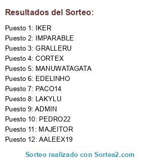 Lista de participantes: PACO14, PEDRO22, GRALLERU, IMPARABLE, AALEEX19, ADMIN, MANUWATAGATA, CORTEX, IKER, MAJEITOR, LAKYLU, EDELINHO.