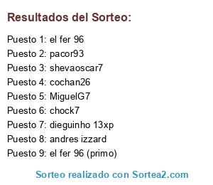 Lista de participantes: el fer 96, el fer 96 (primo), shevaoscar7, cochan26, pacor93, andres izzard, dieguinho 13xp, chock7, MiguelG7.