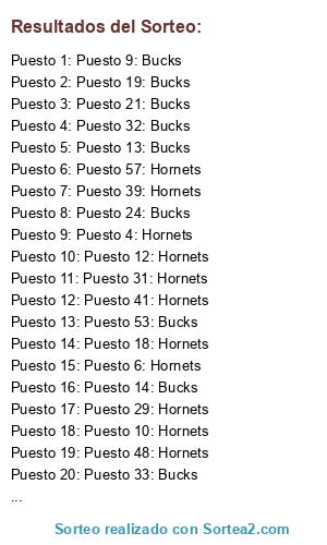 Lista de participantes: Puesto 1: Bucks, Puesto 2: Bucks, Puesto 3: Hornets, Puesto 4: Hornets, Puesto 5: Bucks, Puesto 6: Hornets, Puesto 7: Hornets, Puesto 8: Hornets, Puesto 9: Bucks, Puesto 10: Hornets, Puesto 11: Hornets, Puesto 12: Hornets, Puesto 13: Bucks, Puesto 14: Bucks, Puesto 15: Hornets, Puesto 16: Hornets, Puesto 17: Bucks, Puesto 18: Hornets, Puesto 19: Bucks, Puesto 20: Bucks, Puesto 21: Bucks, Puesto 22: Bucks, Puesto 23: Bucks, Puesto 24: Bucks, Puesto 25: Hornets, Puesto 26: Hornets, Puesto 27: Bucks, Puesto 28: Hornets, Puesto 29: Hornets, Puesto 30: Hornets, Puesto 31: Hornets, Puesto 32: Bucks, Puesto 33: Bucks, Puesto 34: Bucks, Puesto 35: Hornets, Puesto 36: Bucks, Puesto 37: Bucks, Puesto 38: Hornets, Puesto 39: Hornets, Puesto 40: Bucks, Puesto 41: Hornets, Puesto 42: Hornets, Puesto 43: Hornets, Puesto 44: Hornets, Puesto 45: Bucks, Puesto 46: Hornets, Puesto 47: Hornets, Puesto 48: Hornets, Puesto 49: Hornets, Puesto 50: Bucks, Puesto 51: Hornets, Puesto 52: Hornets, Puesto 53: Bucks, Puesto 54: Hornets, Puesto 55: Hornets, Puesto 56: Bucks, Puesto 57: Hornets, Puesto 58: Hornets, Puesto 59: Bucks.