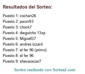 Lista de participantes: el fer 96, el fer 96 (primo), shevaoscar7, cochan26, pacor93, andres izzard, dieguinho 13xp, chock7, MiguelG7.