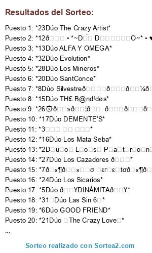 Lista de participantes: *1Dúo PIMPINELA*, *2D͎u͎o͎ L͎o͎s͎ P͎a͎t͎r͎o͎n͎e͎s͎*, *3ꀷꀎꂦ ꀷꏂ ꂦꋪꂦ*, *4Dúo Malaya*, *5Dúo 🔥DINÁMITA🔥*, *6Dúo GOOD FRIEND*, *7🫶🏻ɖนσ ℘εгʄεɕtσ🫶🏻*, *8Dúo Silvestre🕊️🙏🏼🛐*, *9❦︎𝕾𝖔𝖚𝖑𝕸𝖆𝖙𝖊 𝕴𝖓 𝕷𝖚𝖉𝖔❦︎*, *10Dúo LA HERMANDAD*, *11Dúo Indomables*, *12💙 • *~Dᴜ́ᴏ DɪɴᴀᴍɪᴄO~* • ♥️, *13Dúo ALFA Y OMEGA*, *14Duo ŁŌ§ MĀĞØ§ ĐĖĻ ĹÜĎÕ*, *15Dúo TH£ B@nd!døs*, *16Dúo Los Mata Seba*, *17Dúo DEMENTE'S*, *18Duo Los Fieles*, *19Dúo DesTruxTores*, *20Dúo SantConce*, *21Dúo ✰The Crazy Love✰*, *22Dúo Los Inseparables*, *23Dúo The Crazy Artist*, *24Dúo Los Sicarios*, *25Duo Las babys*, *26۞𝔻𝕦𝕠 𝕃𝕒𝕤 𝕃𝕖𝕪𝕖𝕟𝕕𝕒𝕤۞*, *27Dúo Los Cazadores 😎*, *28Dúo Los Mineros*, *29Dúo Pelé🇧🇷 ⚽*, *30Dúo Los invencibles*, *31✜Dúo Las Sin 6✜*, *32Dúo Evolution*.