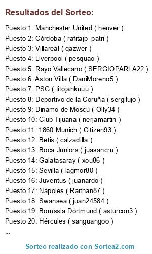 Lista de participantes: 1860 Munich ( Citizen93 ), Alcorcón ( jota_comunio ), Athletic Club de Bilbao ( ssouxx ), Hannover 96 ( arturoultra ), Deportivo de la Coruña ( sergilujo ), Galatasaray ( xou86 ), Dinamo de Moscú ( Olly34 ), Juventus ( juanardo ), Sevilla ( lagmor80 ), Rayo Vallecano ( SERGIOPARLA22 ), PSG ( titojankuuu ), Spartak de Moscú ( soundofmusic10 ), Aston Villa ( DaniMoreno5 ), West Brom ( pipoxarli ), Betis ( calzadilla ), Oporto ( gcamachop ), Lugo ( NapKingMan ), Swansea ( juan24584 ), Shaktar Donetsk ( Guille_GR9 ), Borussia Dortmund ( asturcon3 ), Málaga ( estepi28 ), Granada ( werigui ), Hércules ( sanguangoo ), Celtic ( perabo_torre ), Nápoles ( Raithan87 ), Manchester United ( heuver ), Boca Juniors ( juasancru ), Club Tijuana ( nerjamartin ), Sporting de Gijón ( raimon-05 ), Villareal ( qazwer ), Liverpool ( pesquao ), Córdoba ( rafitajp_patri ).