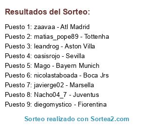 Lista de participantes: cabenico - Milan, arizaintz - Bordeaux, pato2289 - Arsenal, nicolastaboada - Boca Jrs, digital_tanino - Valencia, elponto2 - Manchester City, Mago - Bayern Munich, Nacho04_7 - Juventus, matias_pope89 - Tottenha, velez75 - wolfburgo, oasisrojo - Sevilla, zaavaa - Atl Madrid, javierge02 - Marsella, villano666 - Lazio, diegomystico - Fiorentina, leandrog - Aston Villa, nonoloko - Everton, dhakkonk - Porto.