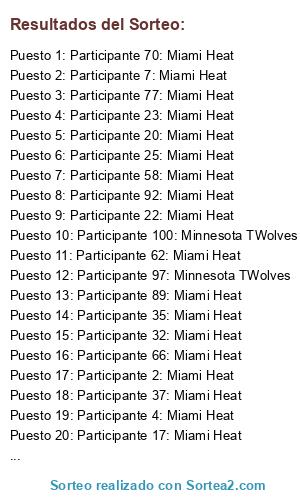 Lista de participantes: Participante 1: Miami Heat, Participante 2: Miami Heat, Participante 3: Miami Heat, Participante 4: Miami Heat, Participante 5: Miami Heat, Participante 6: Miami Heat, Participante 7: Miami Heat, Participante 8: Miami Heat, Participante 9: Miami Heat, Participante 10: Miami Heat, Participante 11: Miami Heat, Participante 12: Miami Heat, Participante 13: Miami Heat, Participante 14: Miami Heat, Participante 15: Miami Heat, Participante 16: Miami Heat, Participante 17: Miami Heat, Participante 18: Miami Heat, Participante 19: Miami Heat, Participante 20: Miami Heat, Participante 21: Miami Heat, Participante 22: Miami Heat, Participante 23: Miami Heat, Participante 24: Miami Heat, Participante 25: Miami Heat, Participante 26: Miami Heat, Participante 27: Miami Heat, Participante 28: Miami Heat, Participante 29: Miami Heat, Participante 30: Miami Heat, Participante 31: Miami Heat, Participante 32: Miami Heat, Participante 33: Miami Heat, Participante 34: Miami Heat, Participante 35: Miami Heat, Participante 36: Miami Heat, Participante 37: Miami Heat, Participante 38: Miami Heat, Participante 39: Miami Heat, Participante 40: Miami Heat, Participante 41: Miami Heat, Participante 42: Miami Heat, Participante 43: Miami Heat, Participante 44: Miami Heat, Participante 45: Miami Heat, Participante 46: Miami Heat, Participante 47: Miami Heat, Participante 48: Miami Heat, Participante 49: Miami Heat, Participante 50: Miami Heat, Participante 51: Miami Heat, Participante 52: Miami Heat, Participante 53: Miami Heat, Participante 54: Miami Heat, Participante 55: Miami Heat, Participante 56: Miami Heat, Participante 57: Miami Heat, Participante 58: Miami Heat, Participante 59: Miami Heat, Participante 60: Miami Heat, Participante 61: Miami Heat, Participante 62: Miami Heat, Participante 63: Miami Heat, Participante 64: Miami Heat, Participante 65: Miami Heat, Participante 66: Miami Heat, Participante 67: Miami Heat, Participante 68: Miami Heat, Participante 69: Miami Heat, Participante 70: Miami Heat, Participante 71: Miami Heat, Participante 72: Miami Heat, Participante 73: Miami Heat, Participante 74: Miami Heat, Participante 75: Miami Heat, Participante 76: Miami Heat, Participante 77: Miami Heat, Participante 78: Miami Heat, Participante 79: Miami Heat, Participante 80: Miami Heat, Participante 81: Miami Heat, Participante 82: Miami Heat, Participante 83: Miami Heat, Participante 84: Miami Heat, Participante 85: Miami Heat, Participante 86: Miami Heat, Participante 87: Miami Heat, Participante 88: Miami Heat, Participante 89: Miami Heat, Participante 90: Miami Heat, Participante 91: Miami Heat, Participante 92: Miami Heat, Participante 93: Miami Heat, Participante 94: Minnesota TWolves, Participante 95: Minnesota TWolves, Participante 96: Minnesota TWolves, Participante 97: Minnesota TWolves, Participante 98: Minnesota TWolves, Participante 99: Minnesota TWolves, Participante 100: Minnesota TWolves.