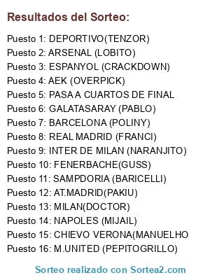Lista de participantes: CHIEVO VERONA(MANUELHO, SAMPDORIA (BARICELLI), INTER DE MILAN (NARANJITO), MILAN(DOCTOR), AT.MADRID(PAKIU), AEK (OVERPICK), M.UNITED (PEPITOGRILLO), DEPORTIVO(TENZOR), PASA A CUARTOS DE FINAL, ESPANYOL (CRACKDOWN), REAL MADRID (FRANCI), GALATASARAY (PABLO), FENERBACHE(GUSS), ARSENAL (LOBITO), BARCELONA (POLINY), NAPOLES (MIJAIL).